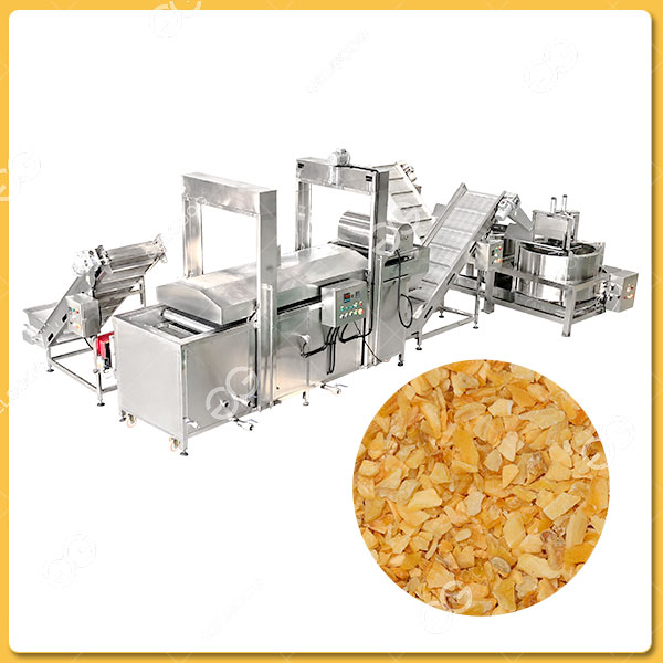 Les tranches d’ail sont acheminées vers la friteuse continue pour la friture. La friteuse de la ligne de production de flocons d’ai est équipée d’un système de contrôle automatique de la température, garantissant un transfert de chaleur stable et uniforme, ce qui permet de déshydrater et de façonner les tranches d’ail rapidement.